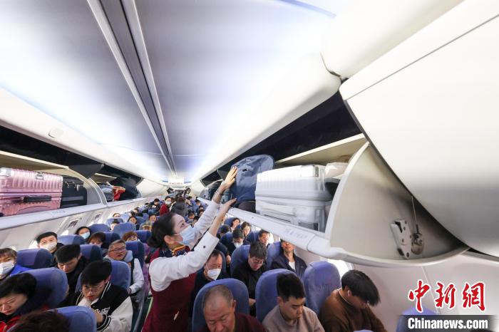 1月28日,从厦门至北京的国航CA1832次航班接近满员,乘务员在飞机起飞前帮旅客摆放行李。记者贾天勇摄