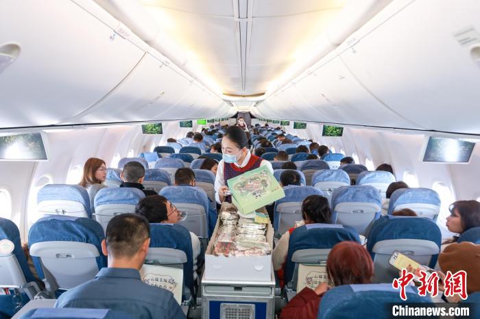 1月28日,从厦门至北京的国航CA1832次航班接近满员,乘务员在机舱内提供餐食。记者贾天勇摄