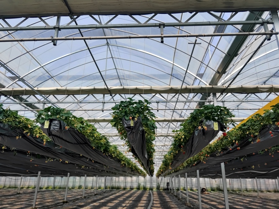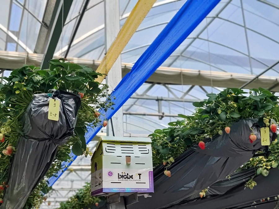 草莓大棚挂有箱子,内有雄峰用于授粉。