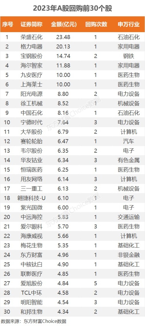 从个股来看,荣盛石化为年内回购金额最高个股,为23.48亿元。格力电器紧随其后,年内回购20.13亿元。宝钢股份居第三位,年内回购14.74亿元。海尔智家、九安医疗和上海莱士年内也回购超10亿元,分别为11.88亿元、10亿元和10亿元。