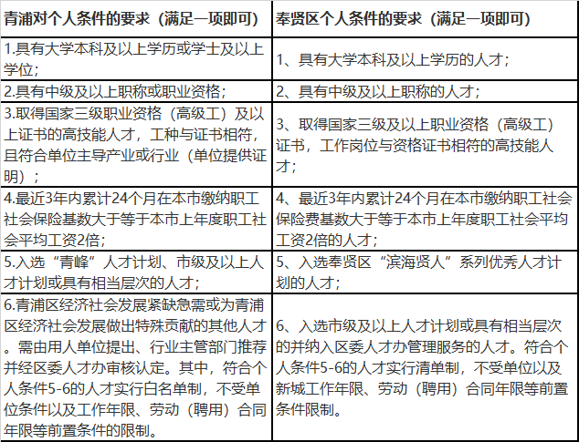 在条件要求方面,青浦的要求相对宽松。青浦区要求,人才所在单位符合青浦区产业发展方向,且工商注册地和税收户管地均在青浦区的企业;或者人才所在单位属于青浦区重点支持引进或为青浦区经济社会发展做出突出贡献的其他单位。