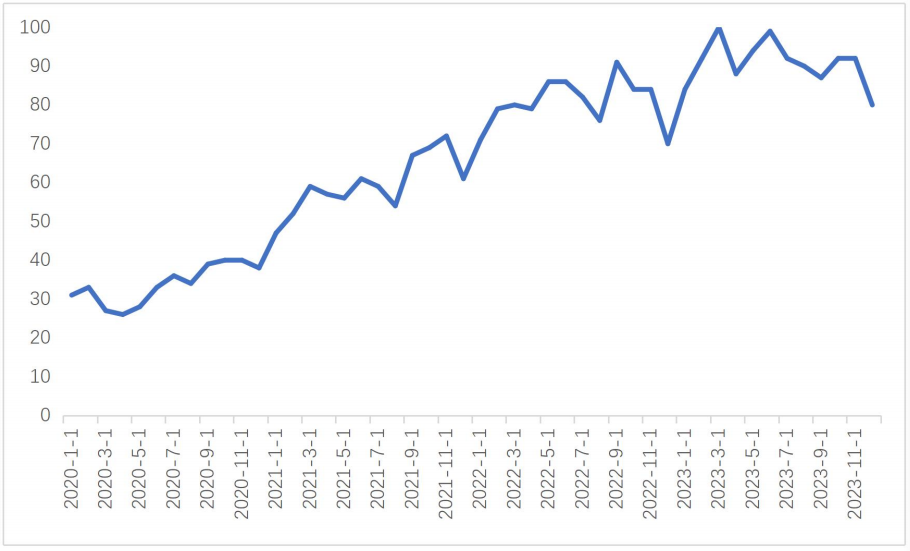 近几年,全球范围内,ESG的关注度呈指数式增长。从谷歌趋势可以看出,2019年以来,ESG词条的热度激增。到2023年,ESG词条的年均热度已超过90,在某些月份甚至达到了满热度值(100)。
